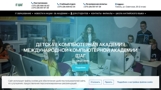 | AI-анализ | This website is a educational institution in Gomele, Belarus, named "Academy SHAG" that offers programming courses for both children and adults. All instruction is provided on-site. Classes are offered during the day, evening, and weekends in the center of Goemele. The website includes information on various IT courses, such as Java and Python, front-end development, testing, internet marketing, UX/UI design, and individual and corporate training. The website also mentions summer and winter "IT camps" for children and teenagers. The contact information provided includes phone numbers for admissions, the academic department, and inquiries about payment. The address of the institution is listed as well. |