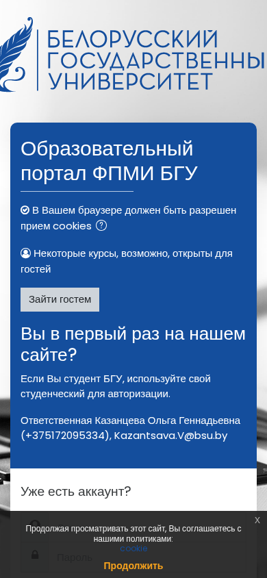| AI-анализ | This website is the educational portal of the Faculty of Physics and Mathematics of Belarusian State University (ФПМИ БГУ). It provides access to the university's educational resources using Moodle platform. The website requires the acceptance of cookies for certain courses, which may be accessible to guests. New users, who are students of the university, should use their student login to authorize. Existing users can log in with their credentials. Forgotten login or password can be recovered using the provided links. The website also includes policies regarding cookies and user agreement. The contact information for the responsible person is provided. |