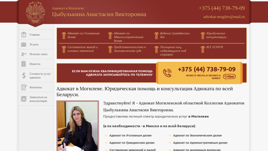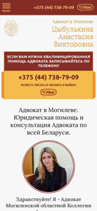 | AI-анализ | This website is for a lawyer named Anastasia Cybulkina based in Mogilev, Belarus. The website offers legal services and consultations for various types of cases in Mogilev, Minsk, and Belarus. Services include representation in criminal, administrative, and civil cases, as well as drafting complaints and lawsuits. The lawyer has experience handling cases in various areas of law and is a member of the Mogilev Regional Bar Association. The contact information provided is a phone number and email address. |