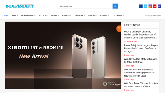 | AI-анализ | The website independent.ng is an online Nigerian newspaper that provides news, top headlines, and breaking news from Nigeria and the world. The title of the homepage is "Home | Independent Newspaper Nigeria," and the description tag includes keywords related to Nigerian newspapers, top news, and breaking news. The website features sections for news, entertainment, politics, sports, business, iSaturday, iSunday, and editorial columnists. The date October 7, 2025, is prominently displayed, and the homepage includes articles on various topics such as technology, politics, and entertainment. Some of the recent articles include "Featured Latest News From Leica Cameras To 7000mAh Batteries: Xiaomi Unveils Its Latest Devices In..." and "Growth Yet To Fully Translate Into Enough Jobs, Tinubu |