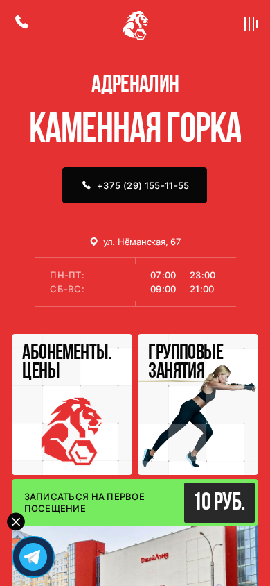 | AI-анализ | The web project 'Адреналин в Каменной Горке | Фитнес-клуб в Минске' is a fitness club located at ul. Nёманская, 67 in Minsk, Belarus. The opening hours are Monday to Friday: 7:00 AM to 11:00 PM and 9:00 AM to 9:00 PM on weekends. The facility offers modern training equipment and affordable prices for fitness classes with discounts and promotions available. Comfortable training sessions take place in clean, climate-controlled rooms with showers. Regular promotions and an 'Adrenaline' membership card offer discounted prices for various fitness activities, including powerlifting, bodybuilding, endurance training, weight loss, and figure correction. The fitness instructors at 'Адреналин' are highly qualified and |