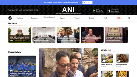 | AI-анализ | This website is titled "Asia’s Premier News Agency - India News, Business & Political, National & International, Bollywood, Sports | ANI News." It provides the latest news on various topics including politics and current affairs in India and around the world, sports, health and fitness, entertainment, and news. The website uses keywords such as ANI, ANI News, latest news, live news, business news, news in India, online news, bollywood news, breaking news, current news, world news, sports news, india latest news, news headlines, news site, news website, top news, India news, entertainment news, national news, political news, Asian News International. The top words on the website include 'india', 'the', 'with', 'new', 'world', 'women', and 'national'. The website features various sections such as National, General News, Politics, |