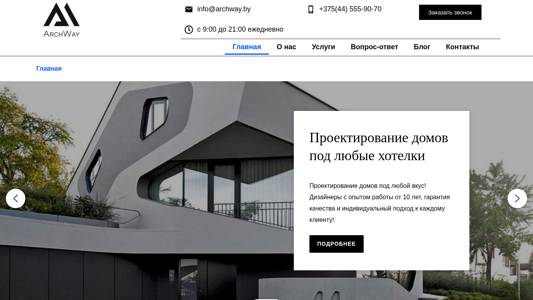| AI-анализ | This online resource, Archway.by, is a website dedicated to architectural design and planning services for various types of buildings. The site offers solutions for designing houses according to different preferences, with experienced designers having over 10 years of expertise. The company guarantees the quality of its work and provides an individual approach for each client. The website contains a blog for sharing information and answering frequently asked questions. The contact information is provided, including an email address and phone number for booking appointments. The site is available daily from 9:00 to 21:00. The homepage features a slideshow showcasing the design of houses tailored to various tastes, emphasizing the versatility and professionalism of the company. The site also offers consulting services for building assessments and has a three-year warranty. If you have a property in need of architectural design or planning, Archway.by is a reliable |