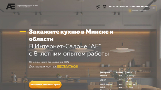 | AI-анализ | --- This website, kuhni.a-e.by, is for a custom kitchen producer based in Minsk and the surrounding area. They offer kitchens in various materials such as massif, plastic, emali, and eco-friendly options. The contact number for inquiries is +375 33 618-18-68. The website includes sections for technologies, catalog, calculator, about the company, and their projects. They claim to offer prices 30% below market and provide free delivery and installation. Kitchens can be made according to photos from the internet without intermediaries. The company uses reliable hardware from brands like Blum (Austria), Hettich (Germany), and MakMart (Italy). They offer under-cabinet lighting and various types of cabinet opening mechanisms. The kitchen body is made of a three-layer, |