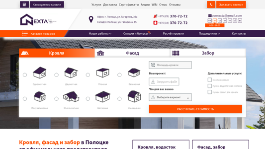 | AI-анализ | The portal nexta.by is an e-commerce website selling roofing and facade materials with delivery across Belarus. It offers a bonus program, financing up to 12 months, and in-stock items. The website's title is "Купить кровлю и фасад по низким ценам в Полоцке | NEXTA" and its description includes keywords such as "кровли," "монтаж," "забор," "фасад," and various brand names like "Grand Line," "Budmat," and "Docke." The website also provides a calculator, information on services, certificates, and promotions. The company's office and warehouse are located in Polotsk, and their contact information includes phone numbers and an email address. The website operates from Monday to Saturday, with extended hours on Saturdays and Sundays for |