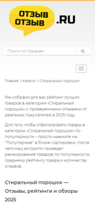 | AI-анализ | The web project "Стиральный порошок — Отзывы реальных покупателей и рейтинг лучших товаров!" is a review and rating platform for laundry powders in Belarus. Users can find verified customer reviews, benefits, and drawbacks of various products in the "Стиральный порошок" category for the year 2025. The website features a catalog with popular laundry powders, including Tide, Ariel, and BioMio, listed with their respective ratings and the number of reviews. Users can sort products by popularity, average rating, and the number of reviews. The website provides information on brands such as Tide, Ariel, and BioMio, with details on their popular laundry powders for white and colored clothing, detergent for children's clothing, and various scents. Other brands like Dosia, B |