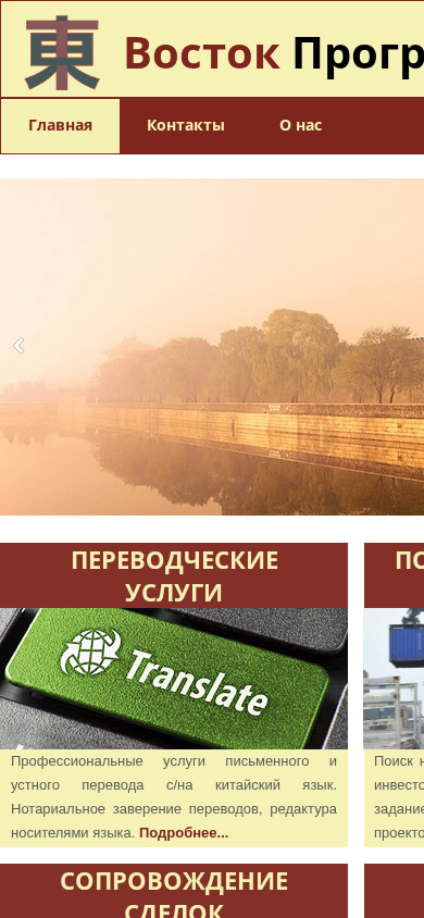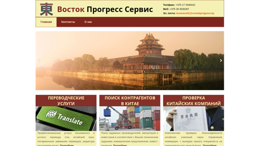 | AI-анализ | This online resource, titled Восток Прогресс Сервис, offers a range of services related to China. These include professional writing and spoken translation to Chinese, finding reliable business partners in China, verification of Chinese companies, and other related services. Keywords for this website include 'China', 'services', 'business', and 'verification'. The homepage contains sections for translations, finding business partners in China, checking Chinese companies, supporting business trips to China, handling business deals, and providing legal consultations. The company's contact information includes a phone number, mobile number, and email address. |