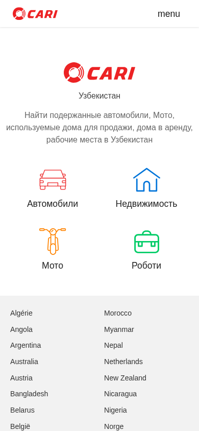 | AI-анализ | This online resource is a marketplace for buying and selling used cars, motorcycles, homes for rent, and job listings in Uzbekistan. The website features a menu with sections for cars, motorcycles, real estate, and jobs. Users can also find listings for these categories in various countries, including Algeria, Angola, Argentina, and more. The top keywords for this website include 'autos' (cars), 'motos' (motorcycles), 'doma' (homes), and 'Uzbekistan'. |