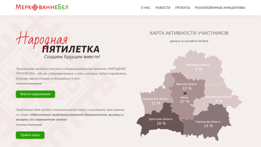 | AI-анализ | language: ru region: BY type: organization category: political theme: society This website, МЕРКАВАННЕ.БЕЛ (merkavanne.bel), is an organization-based website in the Russian language of the Belarusian region, with a title "МЕРКАВАННЕ.БЕЛ" (Merkavanne.bel) and a description inviting visitors to participate in a national project called "НАРОДНАЯ ПЯТИЛЕТКА" (Narodnaya Piatiletka), aimed at collecting opinions and ideas that will shape the future of the country in the next five years. The website encourages anonymous participation and offers a sociological survey on the topic of "Обеспечение продовольственной безопасности: вызовы и ре |