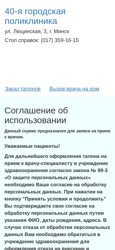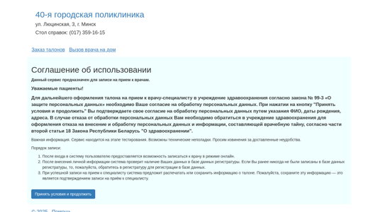| AI-анализ | This online resource is a healthcare service platform that requires users' consent to process their personal data for making appointments with healthcare specialists. The website, 40gplk.medtalon.by, is currently undergoing testing and may experience technical issues. Users are required to provide their full name, date of birth, and address for appointment registration. If users refuse the data processing, they must contact the healthcare institution directly to refuse data collection and processing. The service is designed for scheduling appointments with healthcare providers according to the Belarusian law No. 99-3 on data protection. |