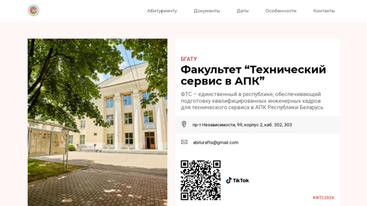 | AI-анализ | This online resource is the official website of the Belarusian State Agricultural Technical University (БГАТУ) Faculty of Technical Service in Agricultural Production (ФТС). The faculty is the sole provider of engineering education in Belarus, catering to the needs of the agricultural sector for qualified technical service personnel. The website provides information on admission procedures, including the submission of educational documents, character references, and certificates of completion for various technical examinations, as well as medical certificates and photographs. The admission process includes both budget and target-oriented enrollment, with separate periods for document submission, technical exams, and enrollment. The faculty offers specializations in Technical Service in Agricultural Production, focusing on the servicing and engineering of agricultural machinery and equipment, as well as Occupational Safety in Agricultural Production. The website also includes a section for frequently asked questions and contact information. The domain is bs |