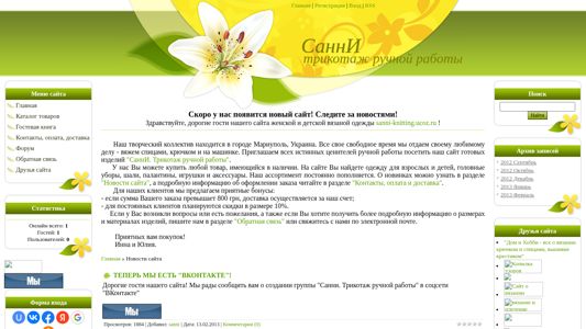 | AI-анализ | The portal "Sanni - Handmade Knitting" is a Russian language website dedicated to handmade knitting. The site offers a variety of knitted items for adults and children, including clothing, hats, shawls, blankets, toys, and accessories. The site features a catalog of available items, a forum for users to share their work, and a guestbook for visitors to leave comments. The site is currently hosted on the Ucoz platform and has had over 1,800 views since its inception in 2012. The site's creators, Inna and Julia, are based in Mariupol, Ukraine, and offer free shipping for orders over 800 grn and a 10% discount for repeat customers. The site also has a presence on the social media platform "VKontakte". |
