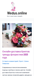 | AI-анализ | The web project Wedus.online is dedicated to wedding preparations. The site offers various sections such as Menus, Entertainment and Shows, Contests, Banquet Decoration and Invitations, Bride's Dress, Hairstyle, Makeup, Bouquet, Accessories, Wedding Traditions and Trends, Wedding Ceremony, Wedding Attire, Engagement and Rings. Keywords associated with the site include wedding, wedding dress, bridal bouquet, banquet hall, rings, wedding customs, and contests. The top words on the site are 'switcher' (11 occurrences), 'menu' (11), 'rings' (10), '2018' (8), 'weddings' (7), 'dress' (7), '2025' (7), 'further' (7), 'wedding-related' |