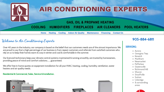 | AI-анализ | The web project "Air Conditioning Experts" is a residential and commercial HVAC company specializing in sales, service, and installation of heating and cooling systems. The company boasts over 40 years of industry experience and a strong customer base built on trust and repeat business. Services offered include maintenance contracts and protection plans for various climate control systems, such as furnaces, air conditioners, heat pumps, and hot water tanks. The website provides information on financing, leasing, and efficiency rebates or credits. The top_words indicate a focus on air conditioning and maintenance, as well as heating, cooling, and indoor air quality. The company serves areas in and around Aurora, Georgina Twp., Keswick, Markham, Newmarket, Pefferlaw, Queensville, Richmond Hill, Sharon, Stouffville, Sutton, and surrounding regions. |
