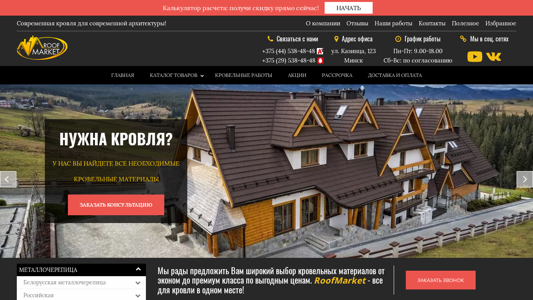 | AI-анализ | The web project 'Roofmarket.by' is an e-commerce platform selling roofing materials and related products in Belarus. The website offers a wide range of roofing materials, including metal tile roofing, composite roofing, profiled metal sheets, and more. Customers can calculate the roof area and receive a discount on their purchase. The company has a physical office in Minsk and works from Monday to Friday, 9 a.m. to 6 p.m., with weekend hours by appointment. The website also provides useful tips, instructions, and customer testimonials. Products include various types of roofing materials, fencing, water drainage systems, and insulation materials. The company claims to work with the best roofing teams and offers a free consultation and measurement service. Delivery and payment options are also available. |