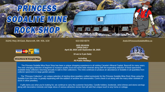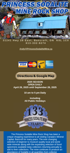 | AI-анализ | The website, Princess Sodalite Mine Rock Shop, is an online shop selling a range of minerals and fossils for collectors. The business is located in Bancroft, Ontario, Canada, and is open from April 28 to September 28, 2025. The shop offers minerals and fossils of various qualities, from beginners to museum pieces. The mine produces an abundance of Sodalite, which is used to create unique sterling silver jewellery, available in the shop. Additionally, the shop sells gift items, such as candle holders, bookends, wind chimes, and stone carvings. The Healy Feely Section of the shop offers alternative healing items, including crystals, pendulums, wands, and metaphysical kits. The website provides information on the shop's location, opening hours, and contact details. |