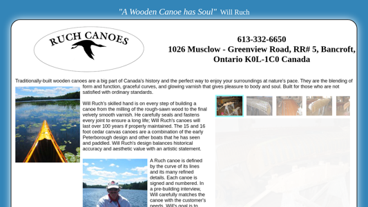 | SEO-описание | Will Ruch crafts traditionally-built wooden canoes which are a big part of Canada's history and the perfect way to enjoy your surroundings at nature's pace. They are the blending of form and function, graceful curves, and glowing varnish that gives pleasure to body and soul. |