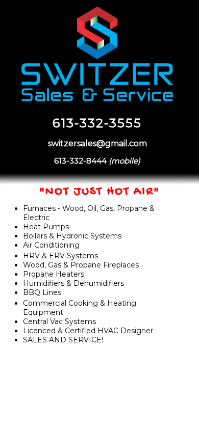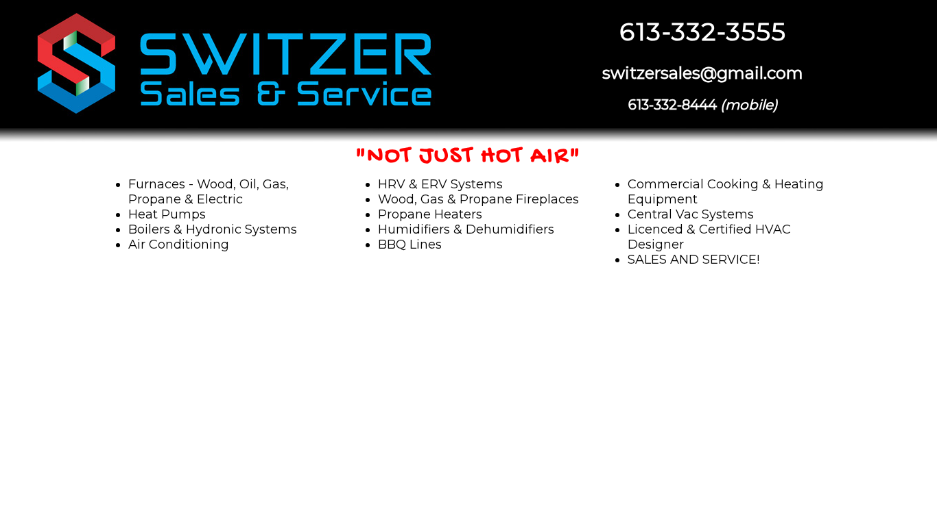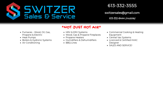 | AI-анализ | This online resource, Switzer Sales & Service, offers sales and service for various types of heating and cooling systems, including furnaces, boilers, hydronic systems, air conditioning, HRV & ERV systems, and wood, gas, and propane fireplaces. They provide options for wood, oil, gas, and electric heat, as well as heat pumps. The website also mentions propane heaters, humidifiers, dehumidifiers, BBQ lines, commercial cooking and heating equipment, and central vac systems. Switzer Sales & Service is staffed by a licensed and certified HVAC designer for sales, and offers 24/7 emergency service for repairs. Their contact information includes a phone number (613-332-3555) and an email address (switzersales@gmail.com), as well as a mobile number (613-3 |