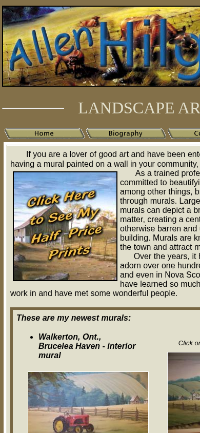 | AI-анализ | language: en country: CA The website is for Allen C. Hilgendorf, an artist based in Bancroft, Ontario, Canada. The website showcases Hilgendorf's work as a landscape artist and mural painter. The artist has created over one hundred murals across Ontario and Nova Scotia, and also produces oil paintings and giclee prints of his work. The website includes images of some of his recent murals and invites visitors to click on them for a larger view. Hilgendorf's artistic style features rural settings and a slower pace of life, and he considers his talent an expression of his love for God and His creation. The website also includes information about contacting the artist and viewing his gallery. |