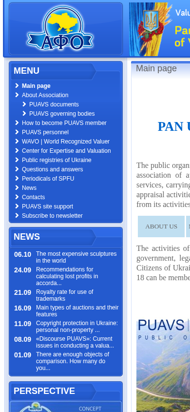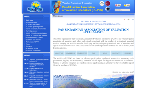 | Ключевые слова | Асоціація Фахівців Оцінки Ассоциация Специалистов Оценки АФО АСО оцінювач оценщик appraiser вартість стоимость ціна цена незалежна оцінка независимая оценка price value valuation Pan Ukrainian Association of Valuation Specialists ФДМУ ФГИУ саморегулювання саморегулирование |