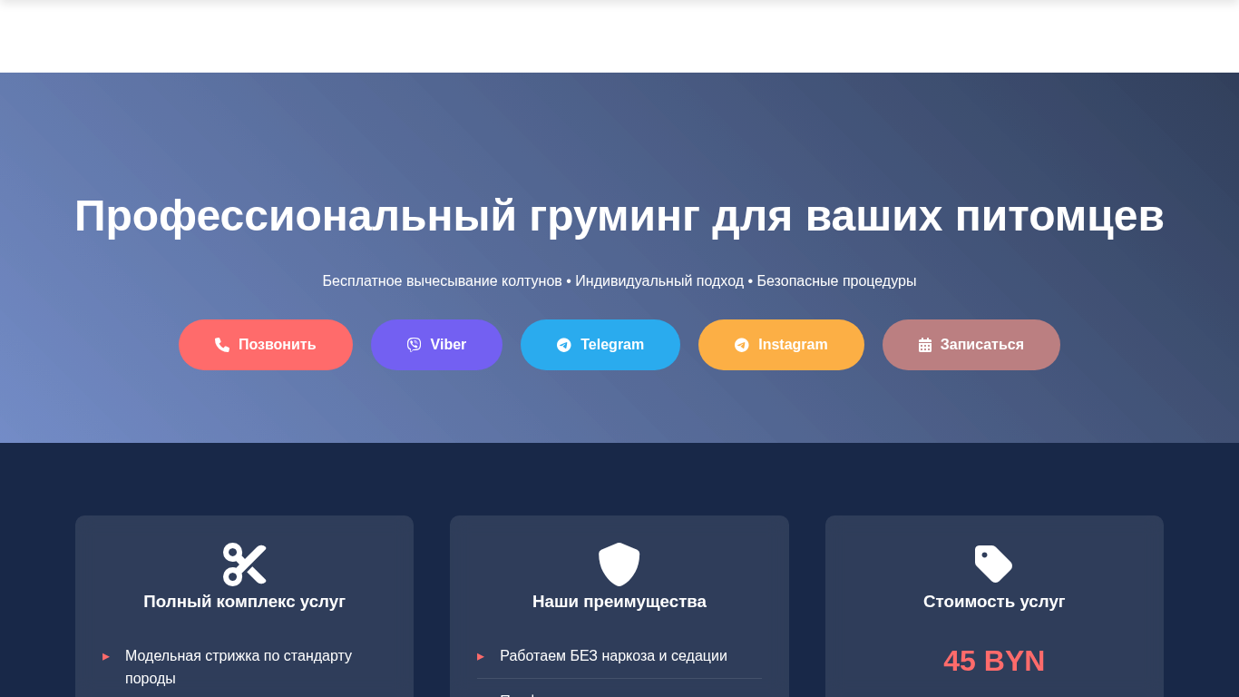 | SEO-описание | Профессиональные услуги груминга для собак и кошек. Стрижка с 2015 года, бесплатное вычесывание колтунов. Безопасно и без стресса. Запись по телефону +375 (29) 654-25-54 |