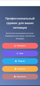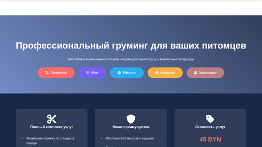 | AI-анализ | The web project "Professional grooming in Minsk | Experience since 2015" offers professional pet grooming services in Minsk, Belarus. With over 7 years of experience, the project provides a full range of grooming services for dogs and cats, including haircut, ear cleaning, teeth trimming, and paw pad cleaning. The website highlights the benefits of a safe and stress-free experience, with free removal of ear knots and the use of professional cosmetics and sterile instruments. The project's unique selling points include working without the use of anesthesia or sedation, and operating from a fixed location in Minsk, Ochochy Alley 19. The website also provides contact information, including a phone number and multiple messaging platforms, for customers to book appointments. Services are priced at 45 BYN for a full groom |