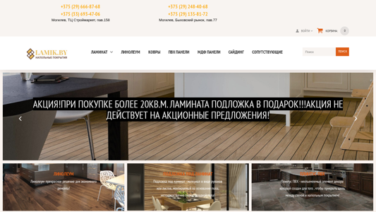 | SEO-описание | Купить Ламинат в Могилёве: Tarkett, Kronostar, Kronospan, Kastamonu, Classen, Kronotex. Ковролин и линолеум, ПФХ и МДФ панели, сайдинг. Доставка и самовывоз из Магазина. |