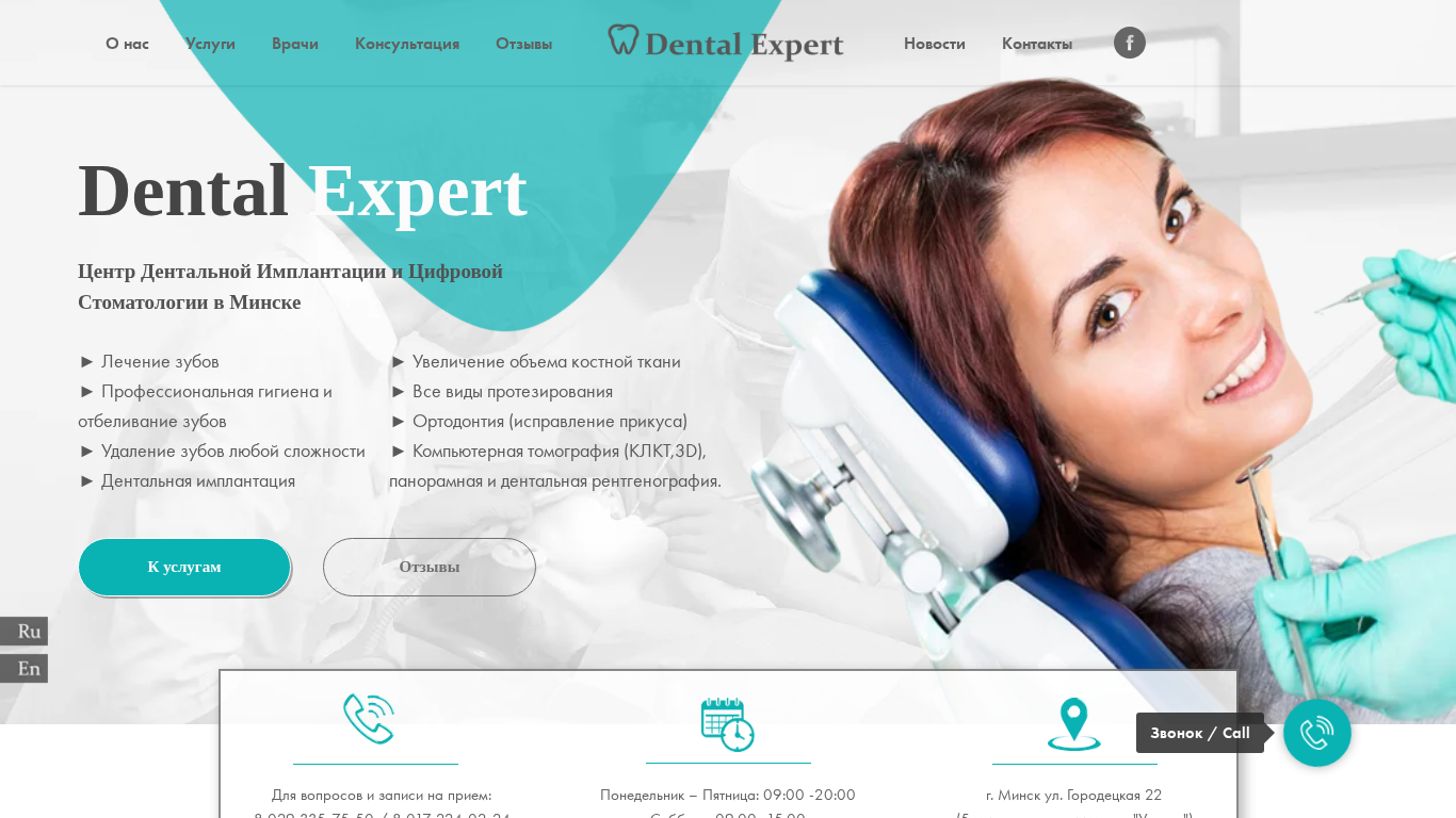 | AI-анализ | This online resource is a dental clinic in Minsk, Belarus named DentalExpert. It offers a full range of dental services in one place. Services include teeth whitening, denture services, tooth extraction, and dental implantation. The clinic also provides computer tomography (CT scan), panoramic and dental X-rays, orthodontics, and consultation. For inquiries and appointments, contact numbers are provided and the clinic is open Monday through Friday from 9:00 AM to 8:00 PM and Saturdays from 9:00 AM to 3:00 PM. The clinic is located in Minsk on Gordetskaya Street 22, a five-minute walk from the Uruchje Metro Station. Dental Expert is not just a dental clinic. It is also a center for advanced dental implantation |