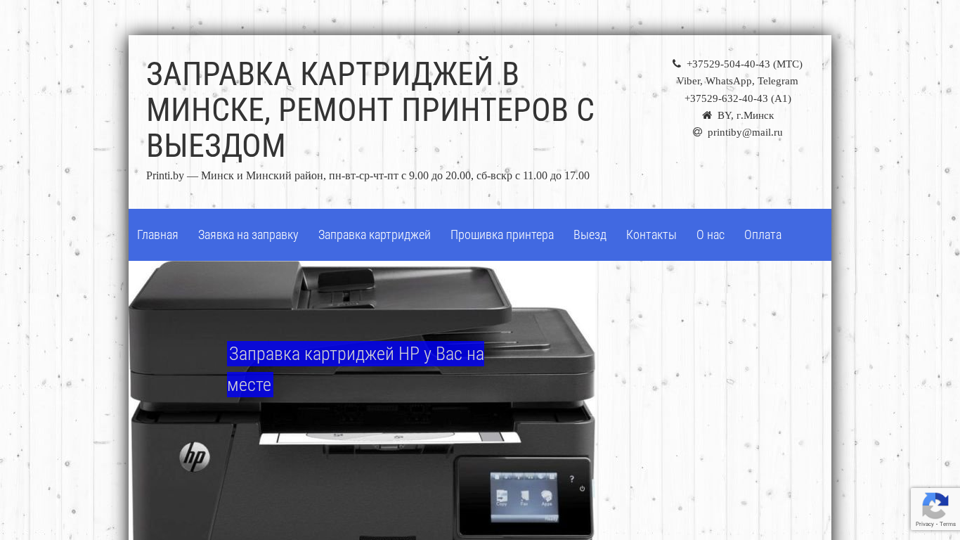 | AI-анализ | This online resource is dedicated to cartridge refilling and printer repair services in Minsk, Belarus. It offers on-site cartridge replacement, laser cartridge refilling for various brands including Brother, Canon, HP, Kyocera, Panasonic, Pantum, Ricoh, Samsung, and Xerox. The website also provides printer firmware upgrades. Users can contact the service through multiple communication channels, including phone numbers for MTS and A1 mobile operators, Viber, WhatsApp, and Telegram, as well as an email address. The website includes a photo gallery and information on pricing and payment methods. The service area is not explicitly stated but can be inferred from the 'Выезд' (Exit) section. |