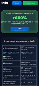 | AI-анализ | --- This online resource is the official website of bookmaker company 1Вин. The website provides access to betting, casino, live dealers, fast mini-games, and poker room. Users can register, log in, and make deposits or withdrawals using various payment methods, including cryptocurrencies. The website is owned by MFI Investments Limited and was launched in 2016. It holds a license from Curacao, number 8048/JAZ 2018-040. The site supports over 20 languages and allows deposits and withdrawals in multiple currencies, including RUB, USD, EUR, KZT, UAH, TRY, and IDR. The minimum deposit and withdrawal amount is 100 RUB and 1500 RUB, respectively. The website offers a bonus program, including a |