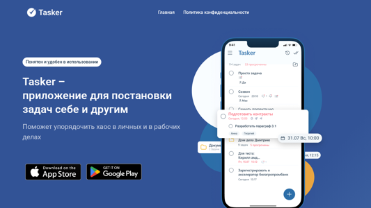 | AI-анализ | This website is for the Tasker application, which is a simple solution for setting tasks for oneself and others. It offers features like synchronization of mobile contacts, automatic creation of tasks, and the ability to group tasks by themes and deadlines. Users can set reminders for themselves and their team members, and the application supports both personal and work-related tasks. The website provides information about the app's features, contact details, and a privacy policy. It also mentions that the company is based in Minsk. |