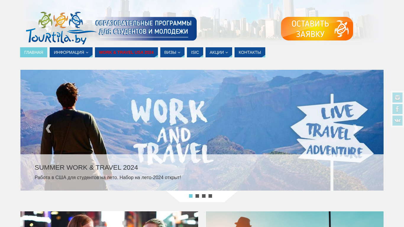 | AI-анализ | The web project "Tourtila" offers you to participate in the most popular student exchange program in the world - Work and Travel USA. This program allows students to gain valuable work experience in a foreign company while also experiencing American life and culture. The conditions of payment and return for Work & Travel USA 2024, visas for the USA and the UK, ISIC cards for students and teachers, and information on self-placement Work&Travel USA and early booking for Work&Travel USA 2024 are provided on the website. The program is open for registration for summer 2024. The company also offers tourist, business, and guest visas for the US and the UK, as well as assistance in their issuance. The office has moved to a new location in Minsk. The contact information and address are provided on the website. An "Invite a Friend" promotion offers a |