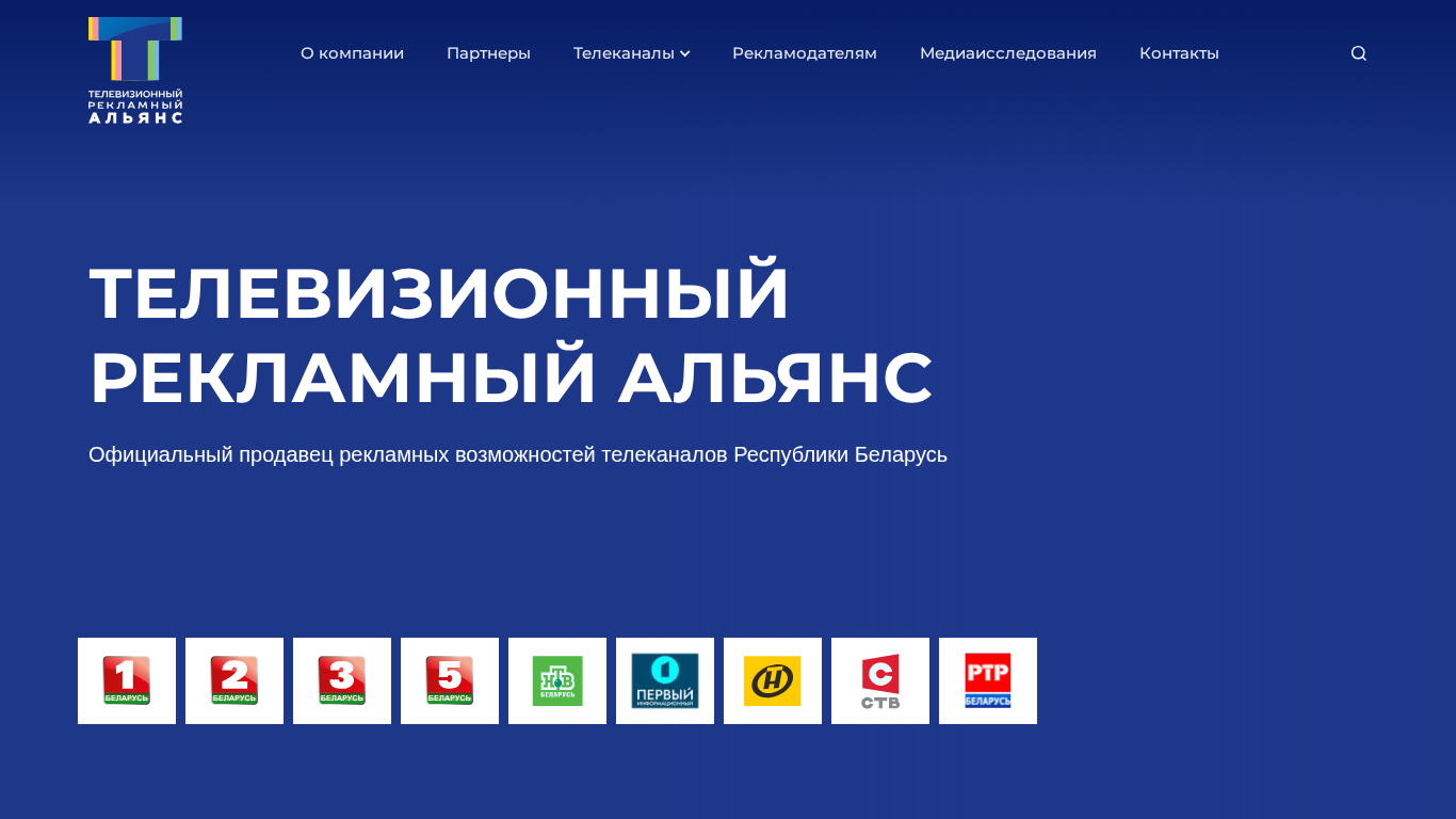 | AI-анализ | This online resource is an official seller of advertising spots on Belarusian television channels: Belarus 1, 2, 3, 5, ONT, STV, Russia 1, NTV, MIR, Europa plus TV, and RUTV. The contact number is +375 17 311 00 15. The website provides information about the company, partners, and the available television channels. It offers advertising opportunities on twelve channels: Belarus 1, Belarus 2, Belarus 3, Belarus 5, First Informational, NTV-Belarus, ONT, STV, Russia-Belarus, MIR, Europa Plus TV, and RU.TV. The market share of these channels sold through the Television Advertising Alliance is 93% of all channels on which advertising |