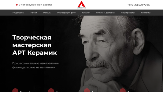 | AI-анализ | --- The portal artceramic.by offers medalions and frames for a monument in Brest. Medalion production includes ceramics, ceramogranite, and metal ceramics, with various sizes. Contact +375 (29) 570 70 55 for ordering. The studio specializes in the professional creation of photo medalions on monuments, high-level retouching, and excellent color transfer. It offers quick turnaround and delivery to regions. Additionally, it provides frames for photo medalions, retouching, and a catalog. The process includes consultation, order placement, retouching, medalion creation, and pickup or delivery. The studio has nine years of flawless work and offers a catalog, payment and delivery information, and contacts. ArtCeramic.BY's work includes background replacement, coloring, aging, and medalion restoration from old |