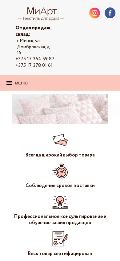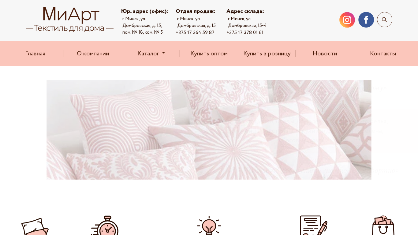| AI-анализ | The web project "Миарт" is a home textiles retailer offering a variety of products including pillows, blankets, bedding, tablecloths, and gobelin items. The company, based in Minsk, Belarus, operates an office at ul. Dobrovskaya 15, pom. № 18, and a sales and storage facility at ul. Dobrovskaya 15-4. Contact information for sales inquiries and orders is provided, along with addresses for the office and storage facility. The website offers a catalog section, as well as information on company history, products, and contact details. Keywords associated with the project include "home textiles," "bedding," and "Minsk." |