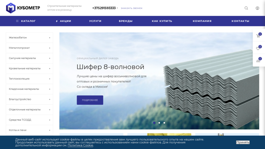 | AI-анализ | --- The portal Cubometr is an online hypermarket for building and industrial products. It offers both wholesale and retail sales. The website includes a catalog and multiple contact options such as phone numbers and social media links for inquiries and orders. The top selling items are related to boilers, plates, floors, and building materials. Other products include pipes, fittings, bricks, signal devices, and industrial equipment. The website provides information about its location in Minsk, Belarus. |