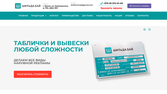 | AI-анализ | --- The website Shilda.by offers various types of signage and plaques in Minsk, Belarus. They provide aluminum, PVC, and orgastek materials. Customers can request a free designer's layout and enjoy delivery across the country. The product range includes diplomas, certificates, and plaques, informational stands, organizational tables, building address signs, office tables signs, technical signs, banners, aluminum frames, wardrobe numbers, volume letters and logos, tactile tables, Braille tables, and tables with a mirror effect. They also provide roll-up and X/L banner stands. Contact information includes a phone number, email address, and a Viber number. |