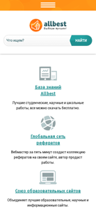 | AI-анализ | This online resource, titled "Allbest - выбери лучшее!" is a database of knowledge and a union of educational websites. The description mentions keywords such as "рефераты, курсовые, дипломы, библиотека," suggesting that it is a platform for sharing and downloading student works, including theses and diplomas, for free. The website also operates as a global network of referees and offers authors the opportunity to sell their works and make their sites more content-rich. The website features a collection of popular works, as well as news and partnerships with other educational websites. Some examples of popular works include "Моделирование и оптимизация бизнес-процессов при управлении организацией" and "Образ успешного преподавателя в представлении студентов старших к |