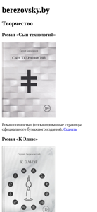 | AI-анализ | --- The portal berezovsky.by is dedicated to the works of Belarusian author Roman Berezovsky. It provides full versions of his official paper publications, which can be downloaded. These include the books "To Elise" (volumes I and II) and "Son of Technologies". The site also features an internet version and a song titled "In Another Country" with its accompanying music video. Keywords associated with the site include "Roman", "fully", "official", "paper", "edition", "download", "Berezovsky". Top words are "роман" (Roman), "полностью" (fully), "официального" (official), "бумажного" (paper), "издания" (editions), "скачать" (download), "berezovsky", "макет" (map |