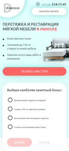 | AI-анализ | The website is a furniture repair service specializing in upholstery work for soft furniture in Minsk, Belarus. The business offers a 12-month guarantee on all types of work and materials, employing professionals with over 12 years of experience, who work exclusively with authorized tools. The site provides information on the types of services offered, including upholstery, replacement of mechanisms and furniture parts, and design changes. Customers can choose from various materials for upholstery, such as anti-wear, velour, microvelour, leather, flock, jacquard, and natural leather. The website allows users to request a call from a master craftsman and offers bonuses like a decorative pillow as a gift. The company provides services throughout Minsk and within the Minsk city limits. The website also includes a section for testimonials and examples of their work |