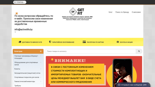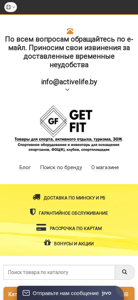 | AI-анализ | --- The website Getfit.by is an online store specializing in the sale of sports equipment and inventory. The store offers a wide range of products for sports, active leisure, tourism, and the ZOJ (Zone Of Joy) lifestyle in Minsk. Customers can place orders with minimal markups, and the store guarantees various conditions for payment and delivery. The store provides a blog, search by brand, and categories such as outdoor training equipment, gym equipment, ropes and cables for crossfit, protective netting, and sports flooring. The store sells equipment for football, volleyball, basketball, handball, and mini football, as well as aluminum sports equipment, gym mats, and gym inventory such as gym benches and horeographic stands. The store also offers delivery within Minsk and Belarus, as well as a guarantee and servicing. The company is registered under |
