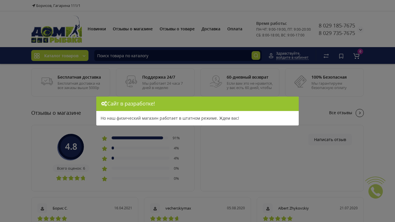 | AI-анализ | The website "Дом рыбака Борисов" (Fisherman's House Borisov) is an online and retail store specializing in fishing equipment and gear. The title and description of the website match its name, providing no further specific information. Keywords related to fishing, such as "крючки" (hooks), "леска" (bait), "катушки" (spools), "удилища" (rods), and "поплавки" (floaters), appear frequently in the top words. The business is located at Гагарина 111/1 in Borisov and operates from Monday to Saturday, with varying hours. Contact information includes two phone numbers and an email address for reklama@interauto.by. The website offers new items, customer reviews, delivery services, and various categories of fishing gear for sale, including fishing lines |