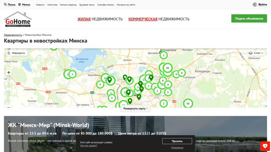 | AI-анализ | --- The website is a real estate marketplace for buying and selling apartments in new construction projects in Minsk, Belarus. It offers a large database of offers from developers, with current prices and photos. Users can purchase apartments directly from the developers without the need for intermediaries. The website is part of the GoHome network and includes sections for other cities and regions in Belarus for buying and renting various types and sizes of residential and commercial properties. |