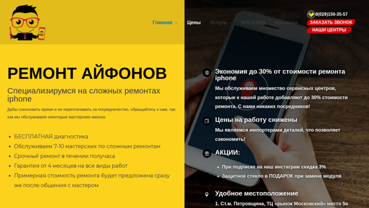 | AI-анализ | --- This website is a repair service for iPhones in Minsk, Belarus, offering affordable prices. The title states that repairs for iPhones have been lowered. The website provides free delivery for repair and return, with a phone number for contact. The main menu includes sections for feedback, vacancies, prices, and services. The services offered include on-site repairs, battery replacement, screen replacement, home button replacement, and camera replacement. The website also operates as an intermediary for certain repair shops in Minsk. The repair diagnostics are free, and they offer a one-hour repair service with a four-month guarantee on all work. The prices are stated to be lower due to their status as importers of repair parts, and they occasionally run promotions. The contact information includes a phone number, and the location includes two addresses for consultation. The price list includes various repair services and their costs, |