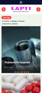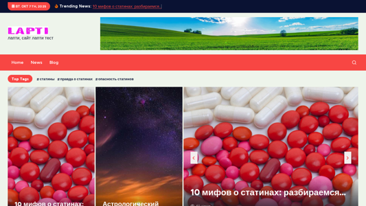 | AI-анализ | This website, titled "лапти — лапти, сайт лапти тест" (slip-slip, site slip test), is a Belarusian domain that primarily focuses on various topics such as news, astrology, fashion, and lifestyle. The description meta tag reveals keywords like "news," "астрологический прогноз" (astrrological forecast), "чато одеть" (what to wear), and "Зеркала Козырева" (Cozyreva's mirrors). The most frequent words on the site include "июня" (June), "мифов" (myths), "статинах" (statins), and "лапти" (slip or slipper). The site offers content related to news trends, astrological forecasts for June, fashion tips for weddings in |