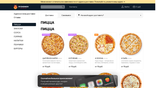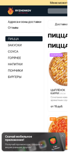 | AI-анализ | The portal Ryzhenkov.by is a cafe menu website for the chain named Ryzhenkov, offering various dishes and delivery options. The menu may vary depending on the delivery address. Users can log in and specify their addresses for delivery. The cafe serves pizza, burgers, and other dishes, including a new carrot burger and a new coppoconi chicken pizza. The dishes come with various sauces, such as tomato and curry, and can be customized with different types of cheese. Prices range from 15 rubles for a pizza topping or a side dish to 15 rubles for a complete pizza with multiple toppings. The website provides reviews for some of the dishes and offers delivery and self-pickup options. The menu includes pizzas like pepperoni, julienne, vegetarian, and hawaiian, as well as sides like onions |