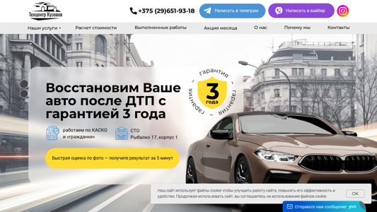 | AI-анализ | The web project is a car repair and painting service based in Minsk, Belarus. It offers repair and painting services for cars at prices reminiscent of "Black Friday." The website guarantees quality work, experienced technicians, and care for customers' vehicles. The site's content is focused on car repair and painting, with keywords such as "repair," "price," and "Minsk" frequently used. The top words on the site include "repair," "price," "auto," "Minsk," "quality," and "garanty." The site offers various services like estimating costs, completed work, and contact information. Users can request a quote through multiple messaging platforms and even receive an instant estimate by answering six questions. The site also mentions a three-year warranty for repairs after accidents. The domain is tehcentr.by. |