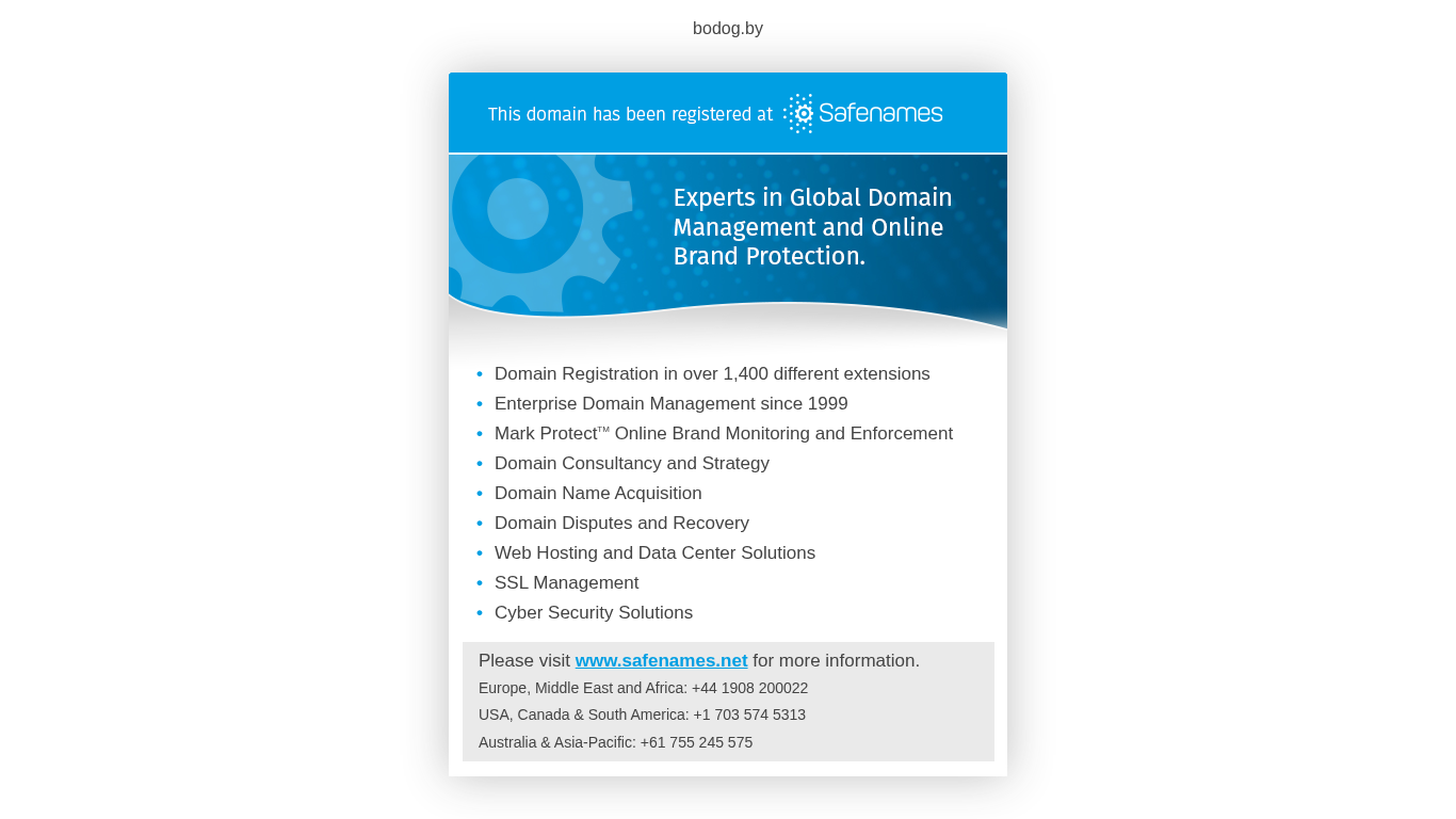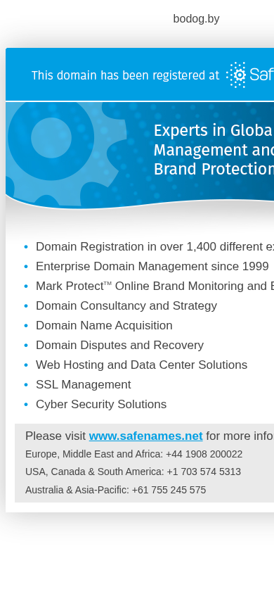 | AI-анализ | language: By The web project "Bodog.by" is a domain registration and management service offered by Safenames. This enterprise has been in operation since 1999 and provides a range of solutions for domain registration, online brand protection, and monitoring and enforcement. The service supports over 1,400 different domain extensions and offers domain consultancy and strategy, domain name acquisition, domain disputes and recovery, web hosting and data center solutions, SSL management, and cyber security solutions. The contact information for Safenames includes phone numbers for Europe, Middle East and Africa, the USA, Canada & South America, and Australia & Asia-Pacific. |