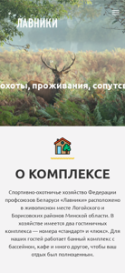 | AI-анализ | --- This website is for a sports-recreational complex named Lavники, offering hunting and recreation services in Belarus. The title is "Спортивно-охотничье хозяйство Лавники — Охота и отдых" and the description includes keywords such as 'complex', 'hunting', 'accommodation', 'rental', 'organization', and 'services'. The top words are 'complex', 'vacation', 'rent', 'hunting', 'details', 'hunting', 'vacation', 'sports-hunting', 'farm', 'lavники', 'sauna', 'pavilion', 'base', 'documents', 'cafe', 'hotel', 'guest', 'rooms', 'bathhouse', 'rental', 'events', and 'rent'. The website contains information about various aspects |