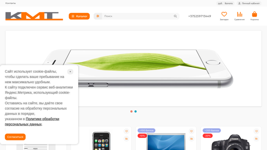 | AI-анализ | The website is an e-commerce platform selling various electronic products, including desktops, laptops, notebooks, components, tablets, software, phones, PDAs, cameras, MP3 players, and mice/trackballs. It offers a personal cabinet for users to manage their orders, registrations, and saved items. The website displays recommended items with points-based rewards. Products for sale include an iPhone, Apple Cinema 30" Display, and Canon EOS 5D. The website also provides information about the company, delivery details, privacy policy, and terms & conditions, as well as a support service, return policy, and links to additional features such as promotions, manufacturers, gift certificates, and a partnership program. The site uses cookies for optimal user experience and is connected to Yandex Metrics web analytics service. |